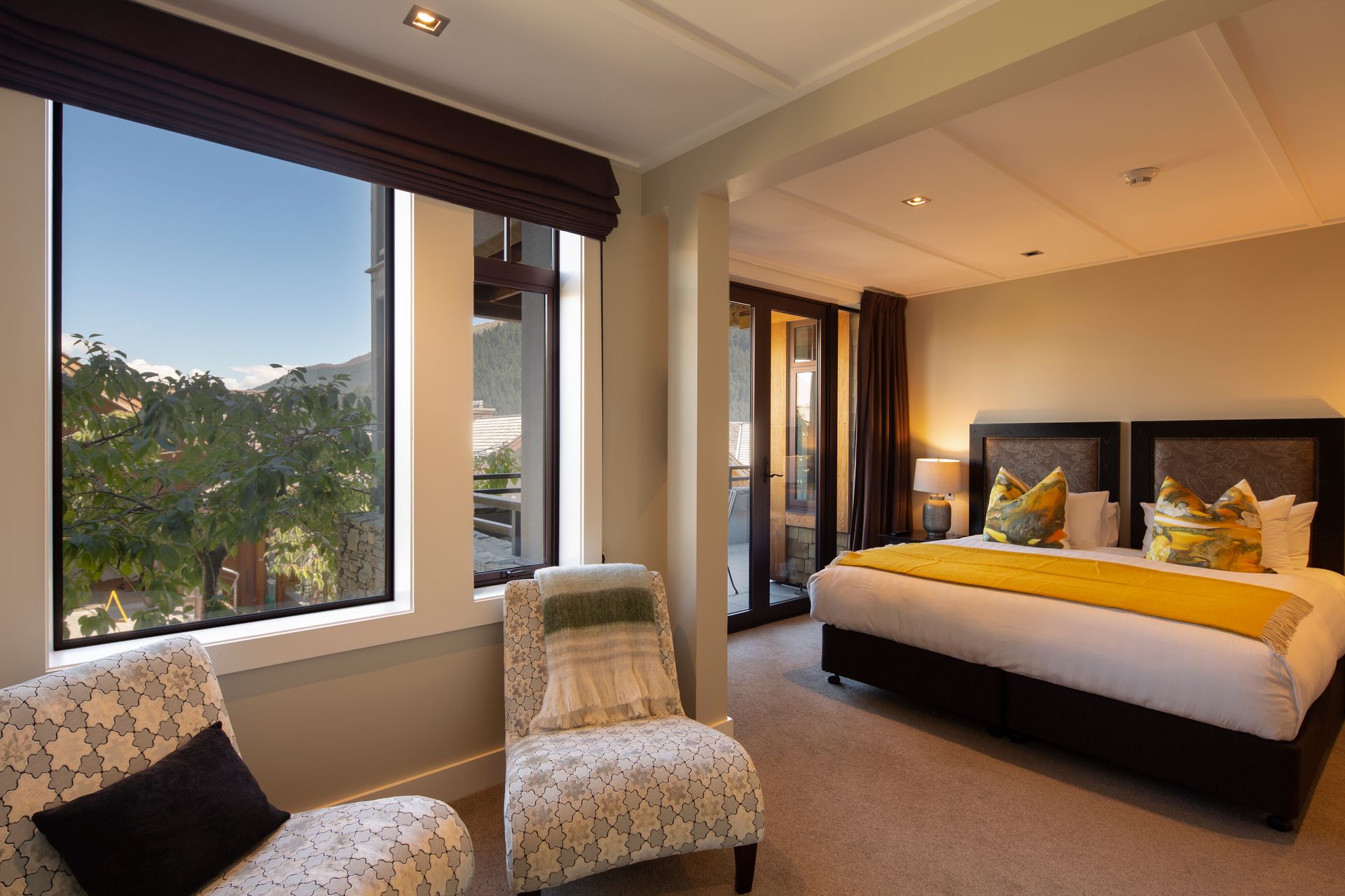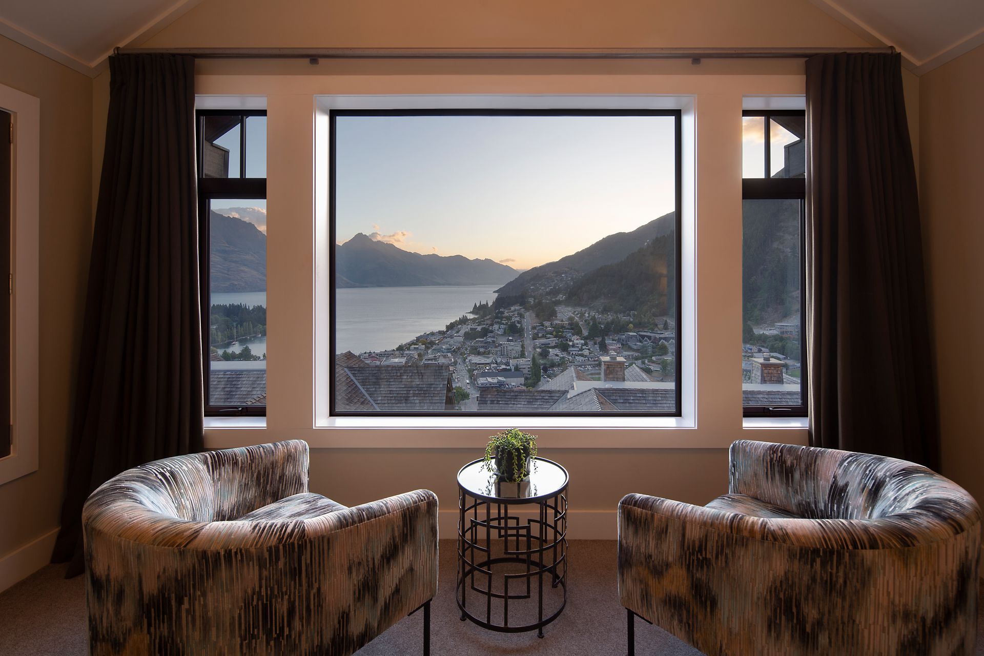 Perfect for families or couples travelling together, this holiday home in downtown Queenstown offers guests a space to come together in the spacious and stylish open-plan living, dining and kitchen area with large windows and a balcony to make the most of the stunning elevated location and beautiful lake views. You’ll find a cosy retreat downstairs with a comfortable sofa, office space and separate bathroom, for those who want to unwind with some alone time. A schist stone fireplace in the upstairs living space offers a cosy alpine feel, which is perfect for the winter – there is also ski storage in the internal garage for your equipment if you are visiting Queenstown for a ski holiday. For the summer months, there is air conditioning available throughout the property to keep you cool and comfortable on those hotter days – an absolute pleasure during our hot Queenstown summers.