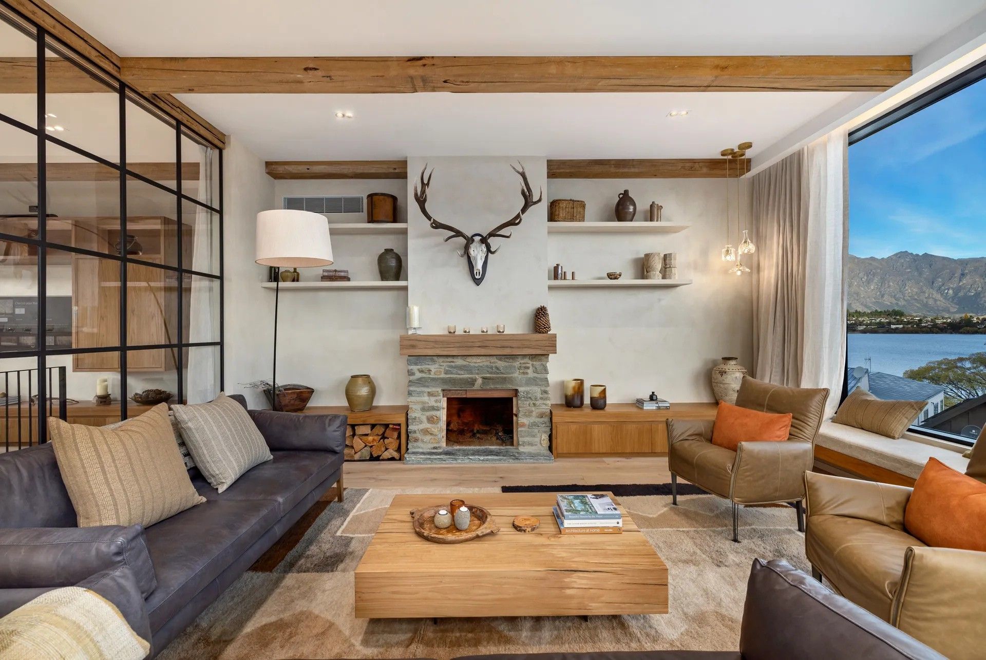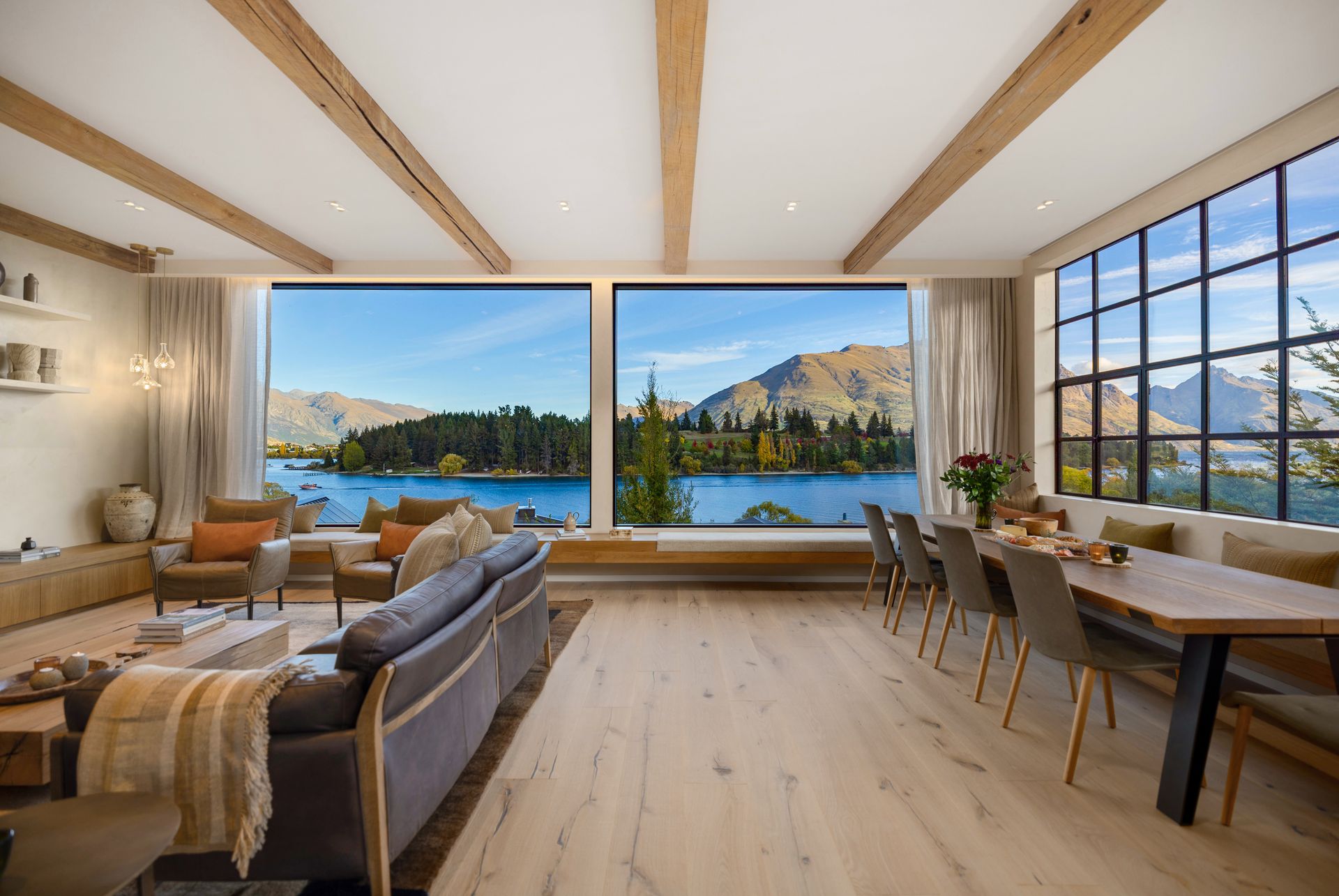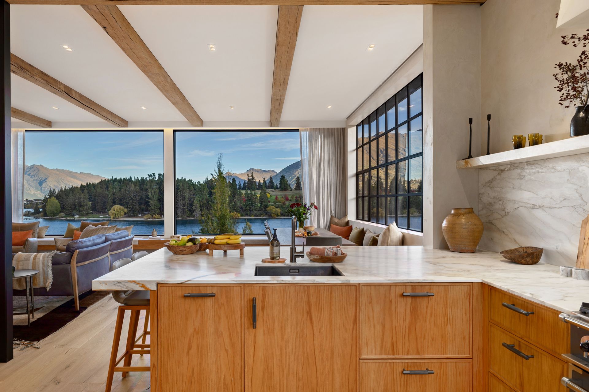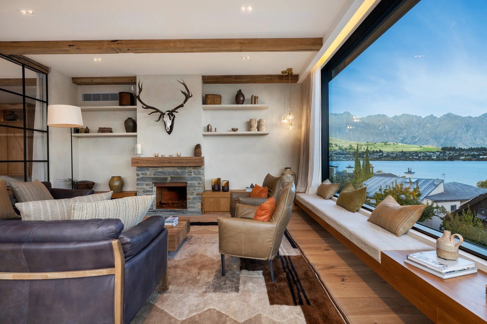 As soon as you step inside you will be in awe of the lake and mountain views on offer from the floor to ceiling windows. The open plan living space is bathed in natural light and the soaring ceilings lend an air of grandeur to the already impressive space. A separate cosy nook provides a spot to curl up with a good book in the sun or enjoy a movie.
