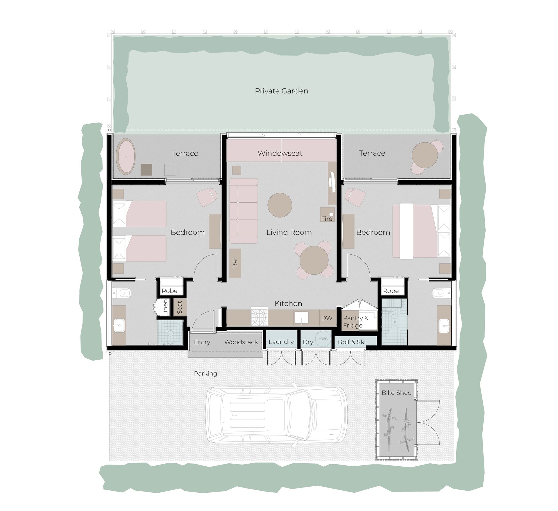 - Private terrace and lawn with spa pool
