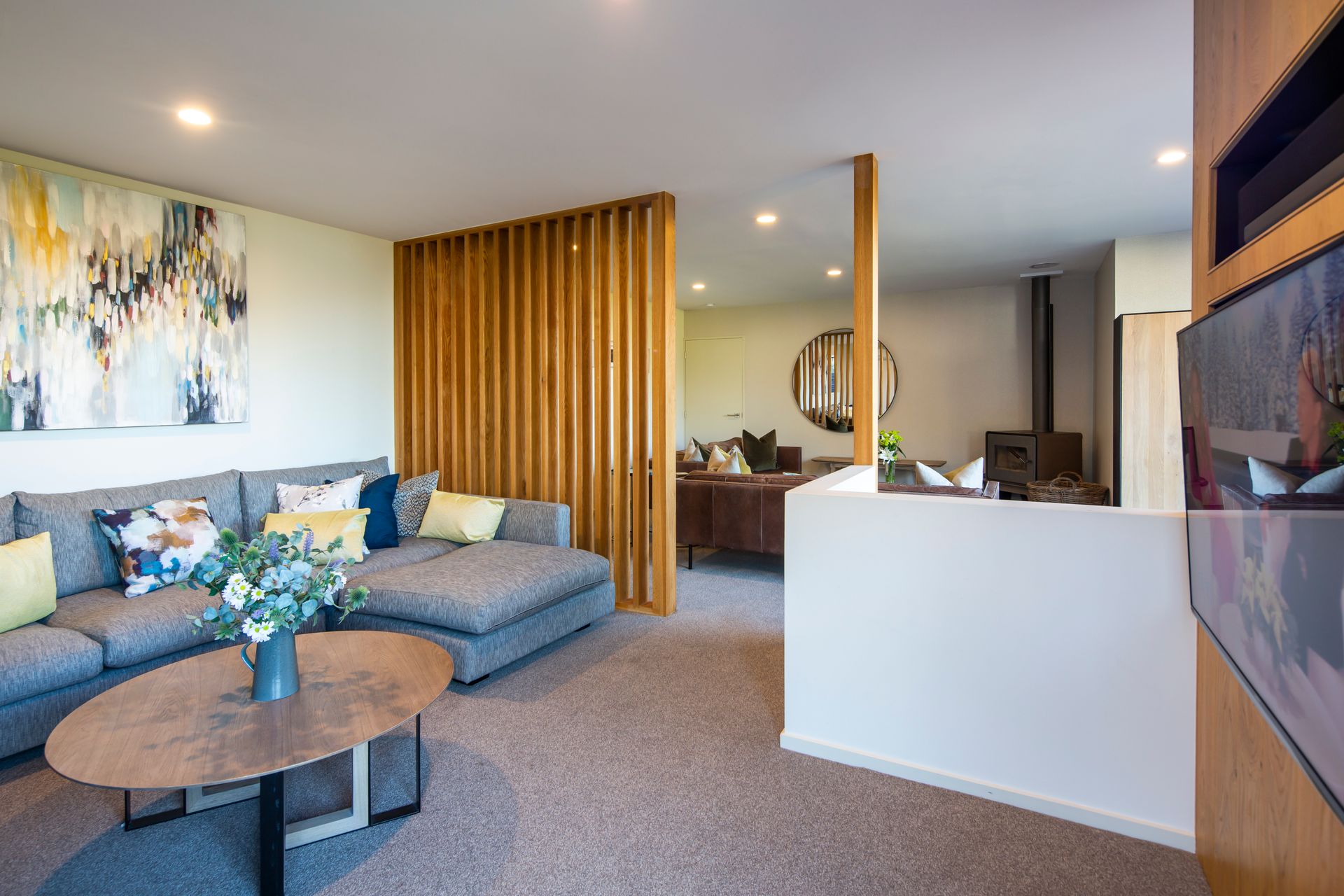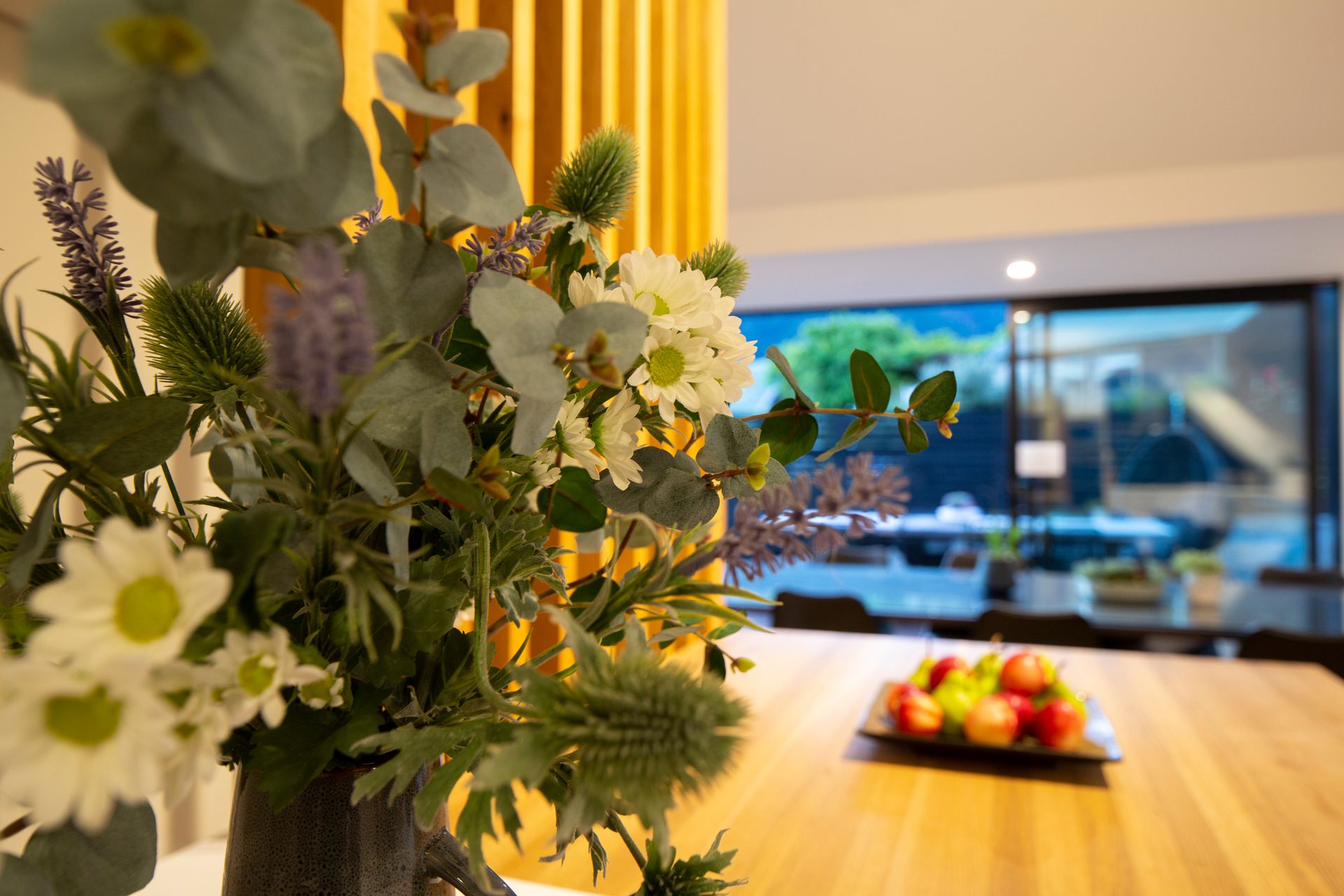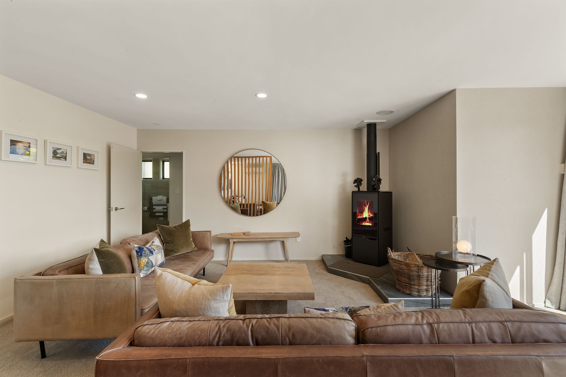 Inside, the modern open-plan kitchen, dining, and living area offer a warm and inviting atmosphere, kept cosy by a wood-burning fireplace on cooler days. The stylish kitchen is fully equipped with high-end appliances, including a coffee machine for your morning espresso and a slow cooker for comforting, home-cooked meals.