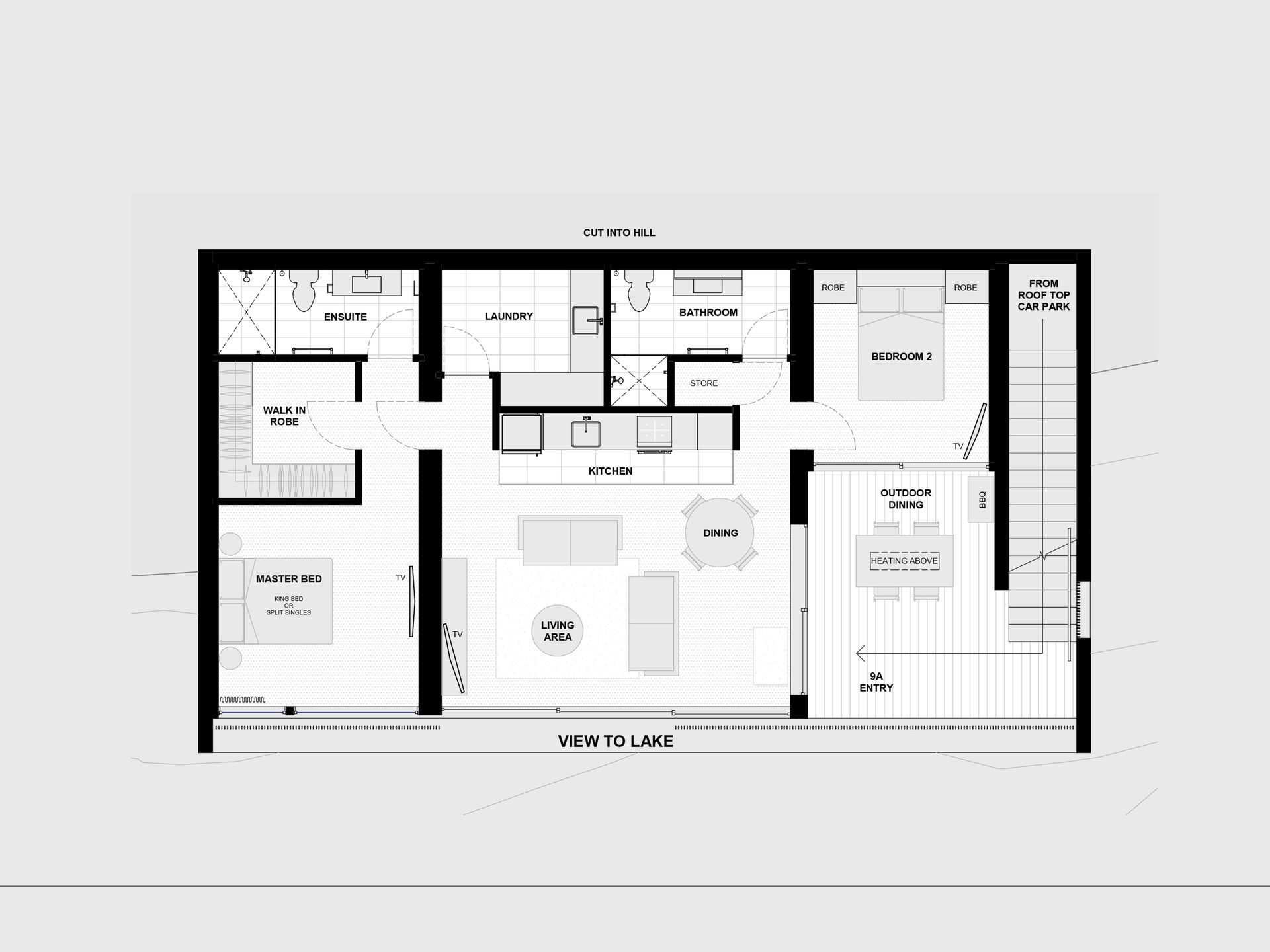 Please note this is the lower-floor apartment, accessed via stairs from the rooftop car park. Please get in touch with us if you would like to book both apartments for a larger group.